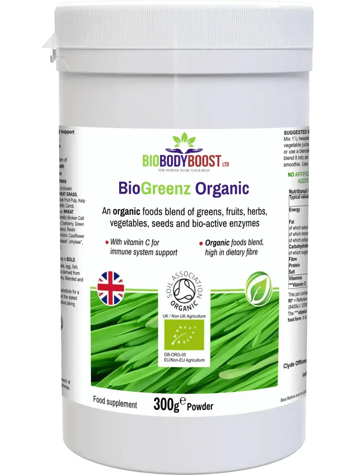 BioGreenz is an organic plant-based wholefood blend with 35+ ingredients including greens, berries, vegetables, mushrooms and enzymes. This nutrient-dense formula supports daily wellness and provides natural vitamin C for immune health.