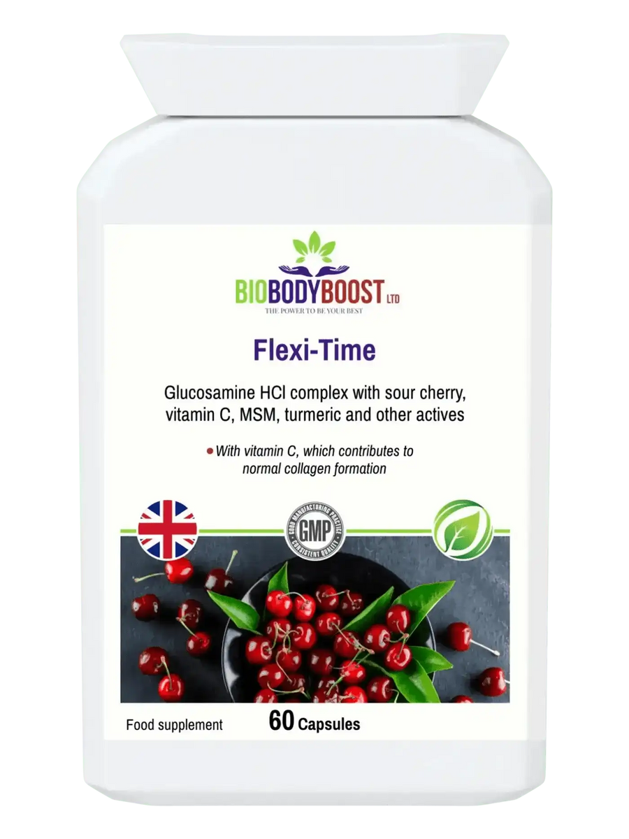 Flexi-Time is a comprehensive, vegan-friendly joint support formula combining Glucosamine HCl, MSM, Montmorency cherry, turmeric, vitamin C, herbal extracts and natural enzymes. Designed to support an active lifestyle, this synergistic blend nourishes connective tissues, supports collagen formation and contributes to the normal function of cartilage, bones and skin.