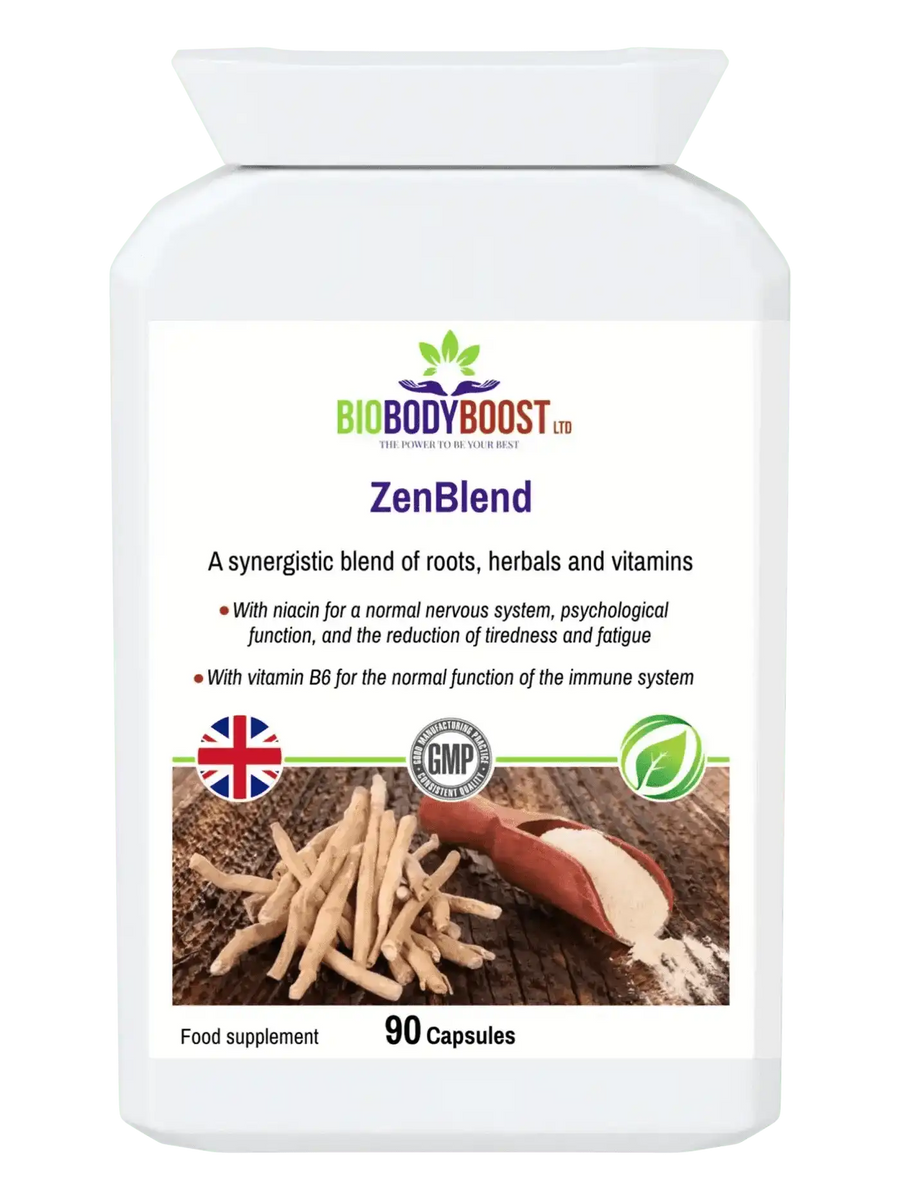 ZenBlend is a balanced adaptogenic supplement that combines Ashwagandha, Rhodiola, Ginseng, Maca, Reishi, and Astragalus with essential B-vitamins for daily wellbeing, clarity, and vitality. This caffeine-free formula supports the body’s natural energy metabolism and mental focus, helping you maintain balance during demanding routines.